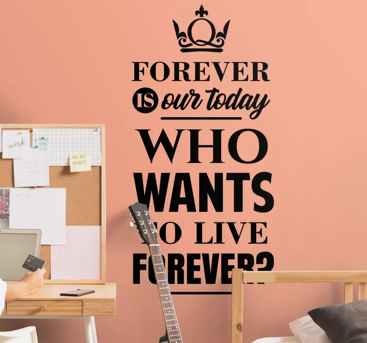 Introducing the Text sticker who wants to live forever, a stunning piece that combines music and inspiration through its powerful typography. The design features poignant song lyrics that encourage a zest for life, beautifully presented in a monochrome style. With its striking text and quote, this product is perfect for those who seek motivation in their environment!