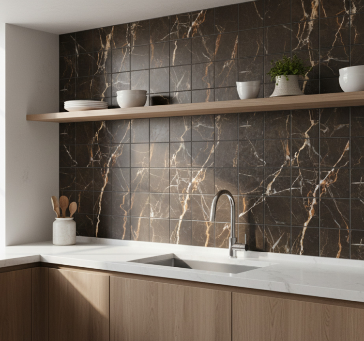 Reference: A54982Transform your space with our Tile sticker black and golden marble design! Featuring a stunning black and golden marble pattern, this tile sticker combines elegance and luxury in a way that enhances any room. Its rich colors and sophisticated design lend an air of refinement, making it the perfect choice for modern decor enthusiasts looking to elevate their interiors.