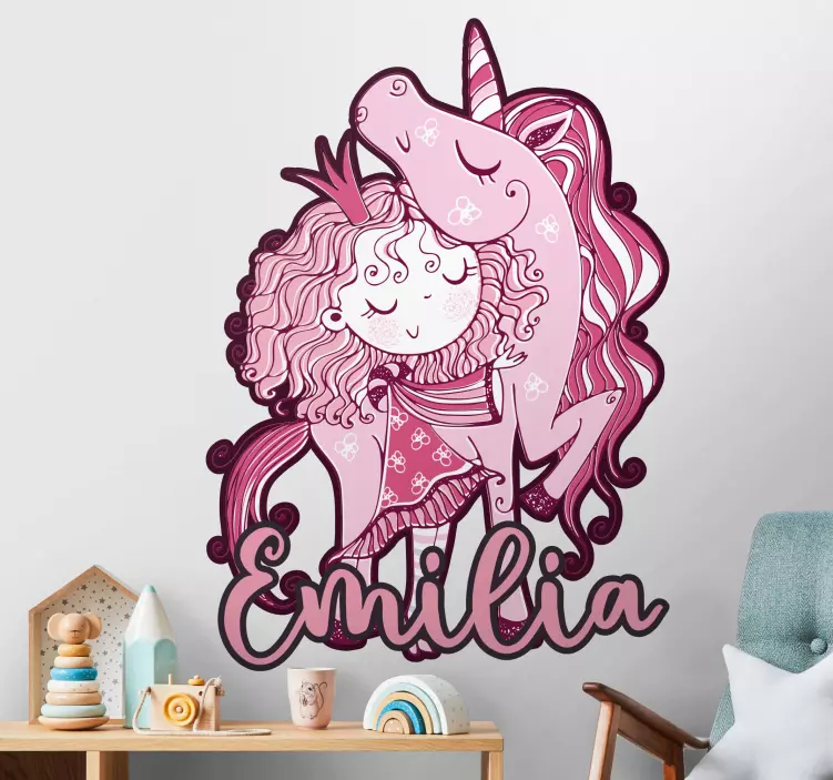 Transform your child's room into a magical wonderland with our Wall stickers for kid pink unicorn embrace. This delightful design features a whimsical princess unicorn, perfect for any little girl's fantasy realm. Each sticker can be customized with your child's name, making it a truly unique addition to their space. The playful cartoon style brings joy and imagination to the room, allowing your child to embrace their dreams!