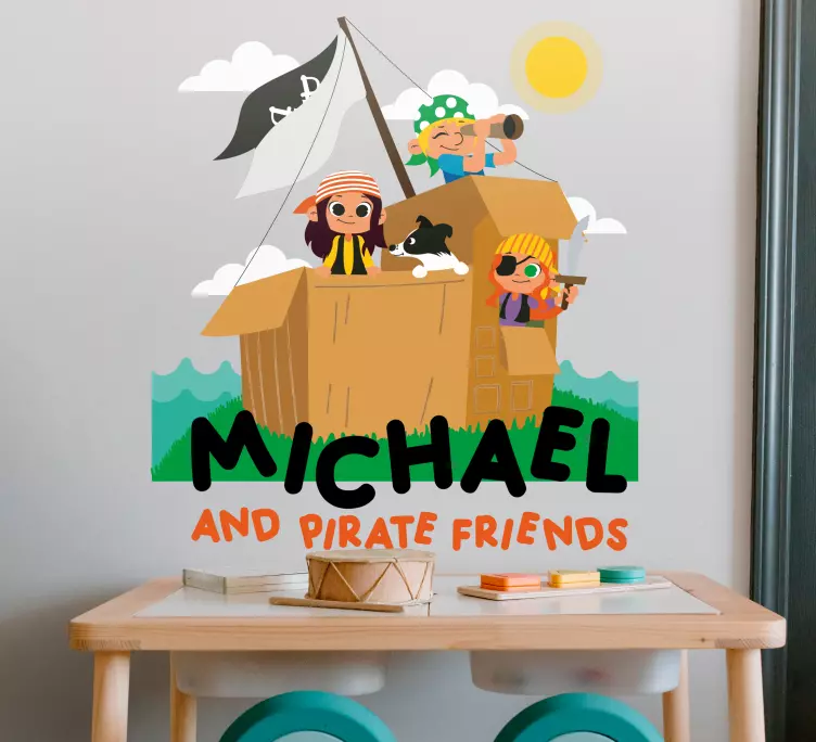Transform your child's space into a vibrant world of adventure with our Wall stickers for kid pirate adventure scene. This enchanting design features playful children embarking on a thrilling journey aboard a pirate ship, surrounded by friends and customizable elements that let your little one see their name among the swashbuckling pirates. The cartoon style brings a sense of fun and excitement, ensuring that every glance at these stickers ignites the spirit of adventure!