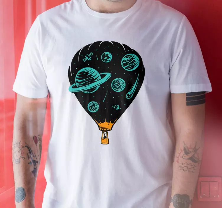 Embark on a whimsical journey with our Adventure through space t-shirt, featuring a stunning graphic design that showcases a hot air balloon soaring through a vibrant cosmos filled with planets and other celestial wonders. This space theme illustration captures the essence of travel and exploration, inviting wearers to embrace their adventurous spirit and explore the colorful universe. With its conceptual and cosmic vibes, this shirt is perfect for those who dream of the stars!