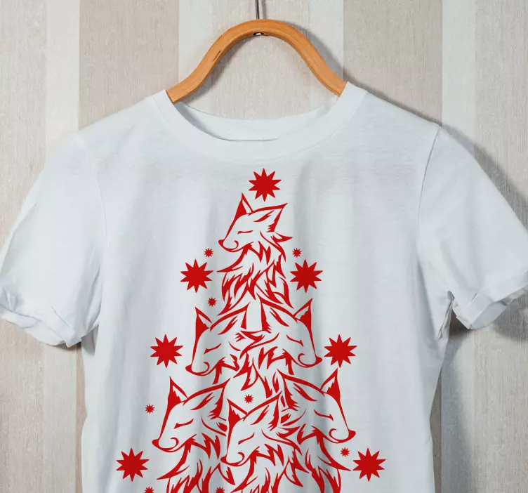 Reference: T5438This unique festive design features intricately arranged wolf heads in a pyramid formation, complemented with star motifs. The vibrant red color stands out against the white background, making it an eye-catching piece perfect for the holiday season.