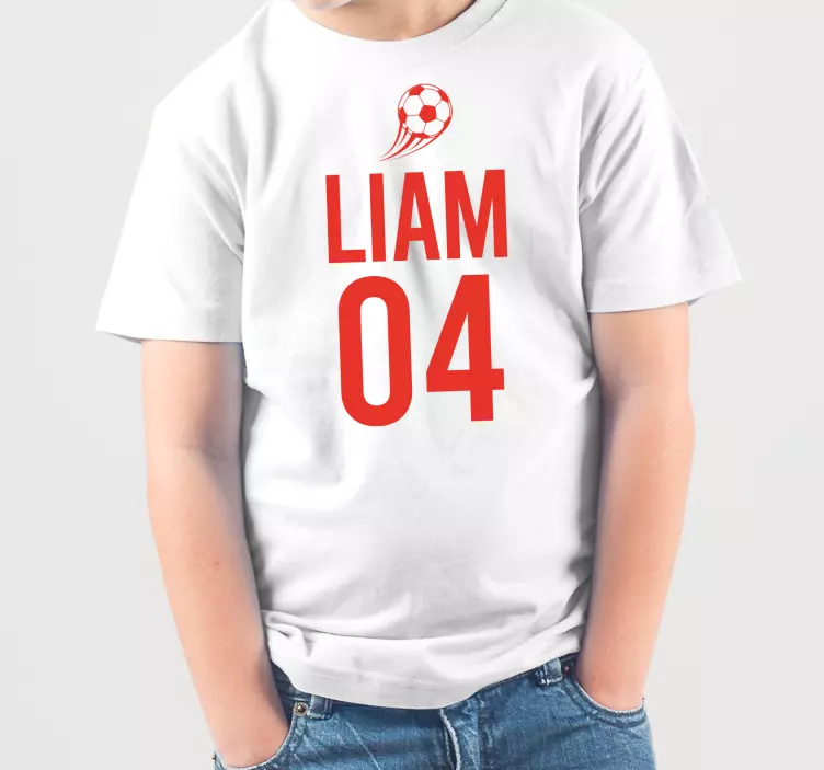 Introducing our Kids T-shirt Liam Soccer Game, a delightful blend of playful design and sporty spirit! This custom t-shirt features a vibrant graphic that showcases a football and a ball design, perfect for any young athlete. The personalized touch makes it special, with the ability to add a name and number for that unique flair. Designed in a striking combination of white and red, this shirt is not just a piece of clothing; it's a statement of passion for sports and the love for the game!