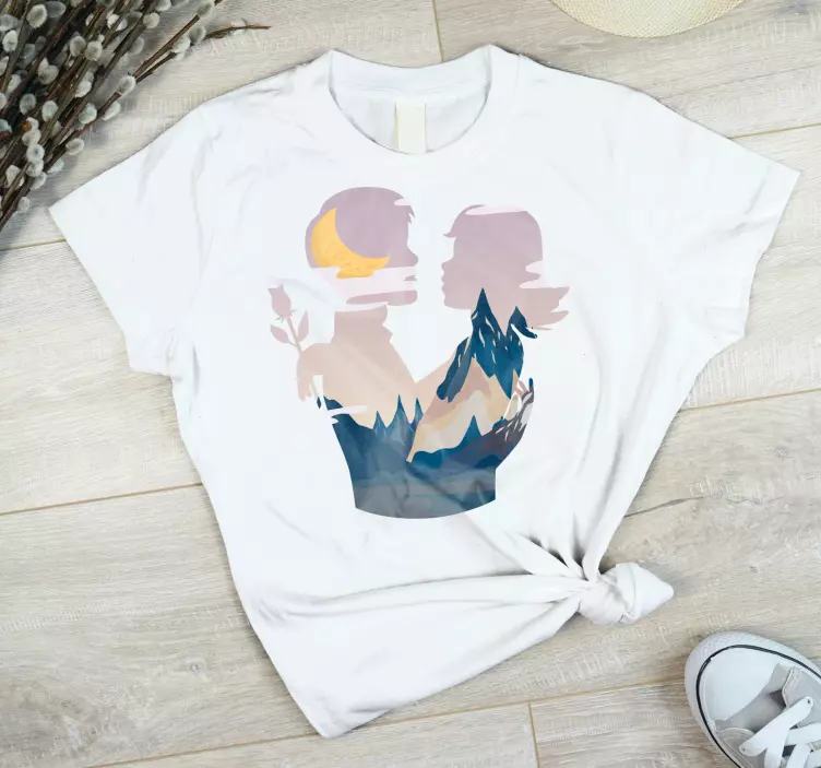 Experience the beautiful connection between a mother and her daughter with our stunning Mother and daughter t-shirt silhouette of bonding. This design elegantly captures a nipponese style illustration that showcases a tender moment shared under the moon and surrounded by majestic mountains. The silhouettes embody love and a familial bond, making it a perfect expression of the special relationship between mothers and daughters.