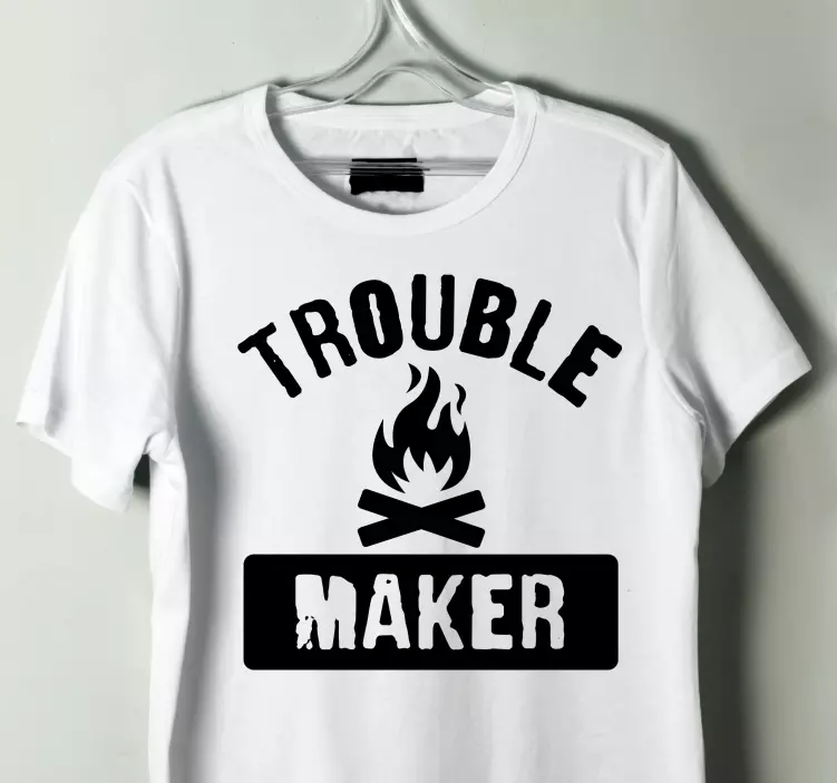 Reference: T5448This eye-catching design features bold text reading 'Trouble Maker' accompanied by a flame and campfire symbols. It's perfect for those who embrace a fun and adventurous spirit. The contrast of black on white adds an element of excitement and captures attention effortlessly.