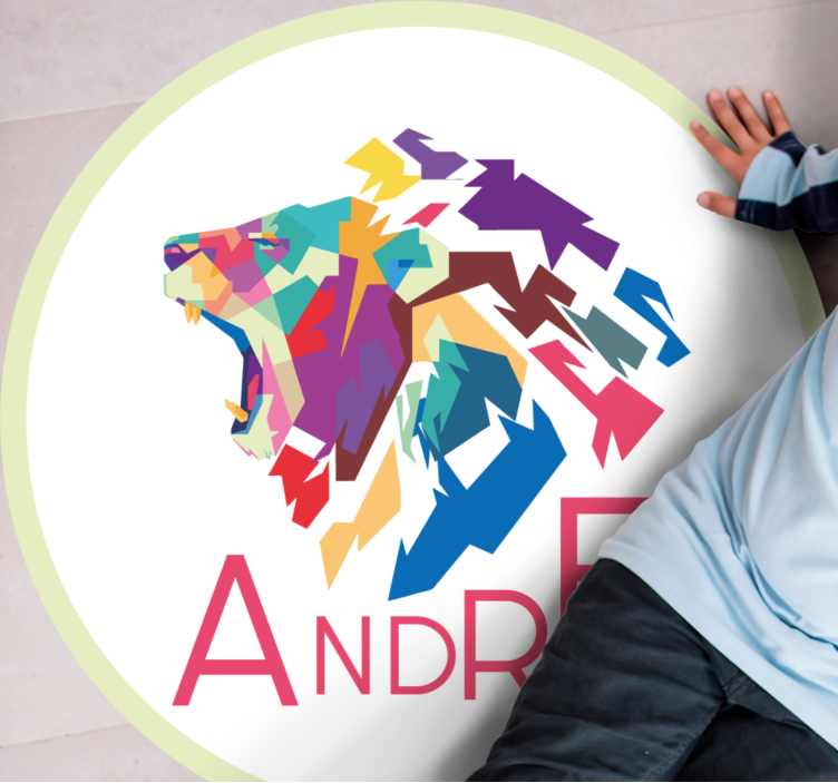 The Colorful Lion Personalization custom vinyl rug features a captivating and vibrant design, showcasing a polyangular lion in a colorful and customizable format. Personalize this rug with your name or text for a unique touch!