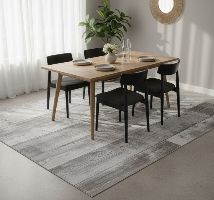 The Dining room vinyl rug in grey wooden planks dining room vinyl rug is an exceptional choice for those looking to elevate their interior decor. Its sophisticated wooden planks design effortlessly complements various styles, from modern to rustic. Not only does it enhance the aesthetic appeal of your dining area, but it also creates a cozy environment where family and friends can gather and enjoy meals together!
