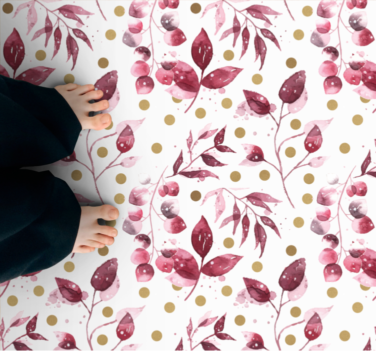 Transform your space with our stunning Floral vinyl rug botanical print design, featuring a vibrant array of burgundy, pink, and green hues beautifully hand painted in a delicate watercolour style. This charming illustration showcases intricate leaves and a unique pattern accented with gold, making it a perfect statement piece for any room!