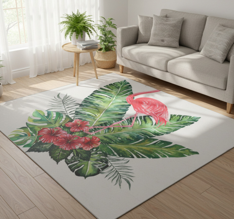 Floral vinyl rug with big tropical flamingo