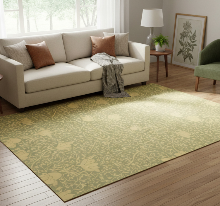 Reference: R22060Transform your space with our stunning Floral vinyl rug with a gold and green floral design. This exquisite piece features a captivating floral motif that beautifully combines rich gold and lush green hues, creating an inviting atmosphere in any room. With its easy-to-clean surface, anti-slip backing, and protective qualities, this rug is not just a decor item; it's a practical solution for your home!