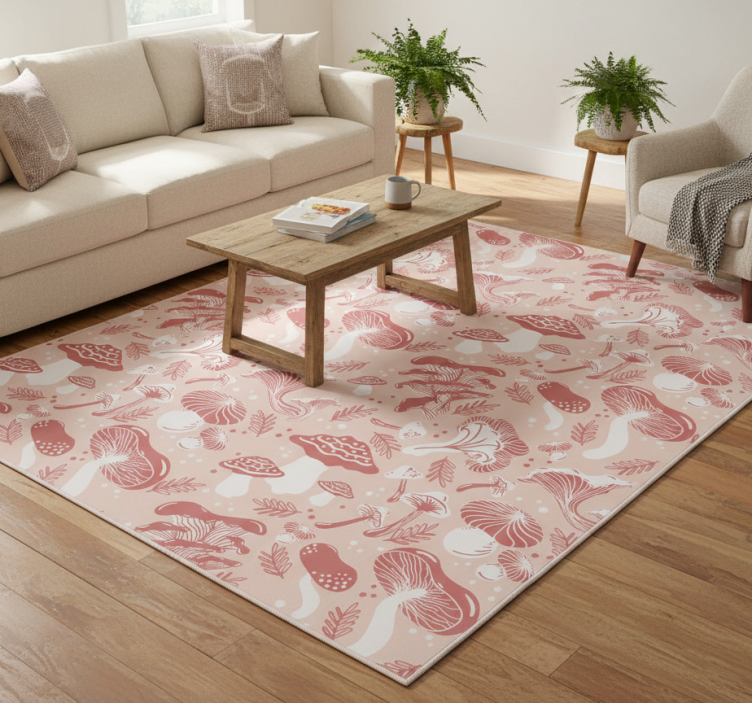 Floral vinyl rug with forest mushrooms on beige