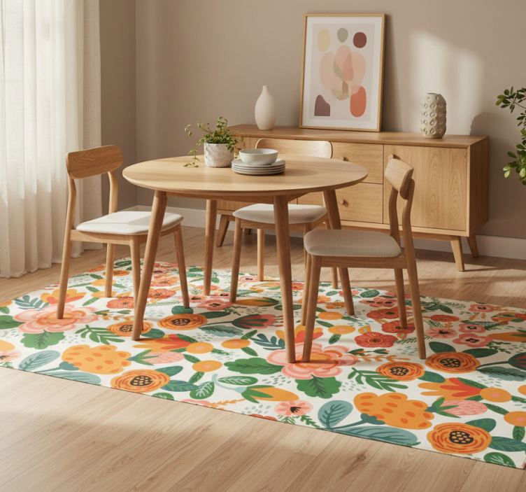 Caring for your Floral vinyl rug in red and orange folk design floral vinyl rug is a breeze! Simply wipe it down with a damp cloth or use a mild detergent for any stubborn spots. Keeping it looking fresh and vibrant is as easy as that!