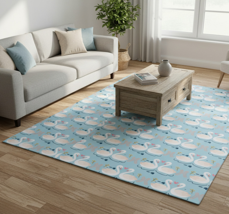 Floral vinyl rug with swans in love on blue