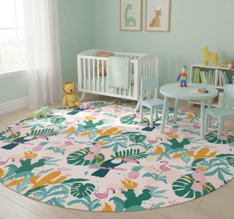 The Tropical birds and leaves animal vinyl rug is a perfect choice for decoration, as it effortlessly infuses your living space with an exotic flair. Imagine a cozy corner where you unwind, surrounded by the lively colors and cheerful imagery of tropical birds, making every moment feel like a getaway. This rug is not just a floor covering; it's a statement piece that inspires creativity and adds a touch of adventure to your home!