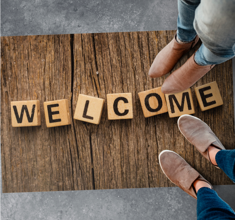 Reference: R11522The Wooden Alphabet Welcome custom vinyl rug is a unique and stylish addition to any home decor! With its earthy tones and wooden texture, this rug features a welcoming message spelled out in alphabet letters, creating a warm and inviting atmosphere. The design is graphically depicted with wooden cubes and blocks, adding a touch of whimsy and charm to any space.