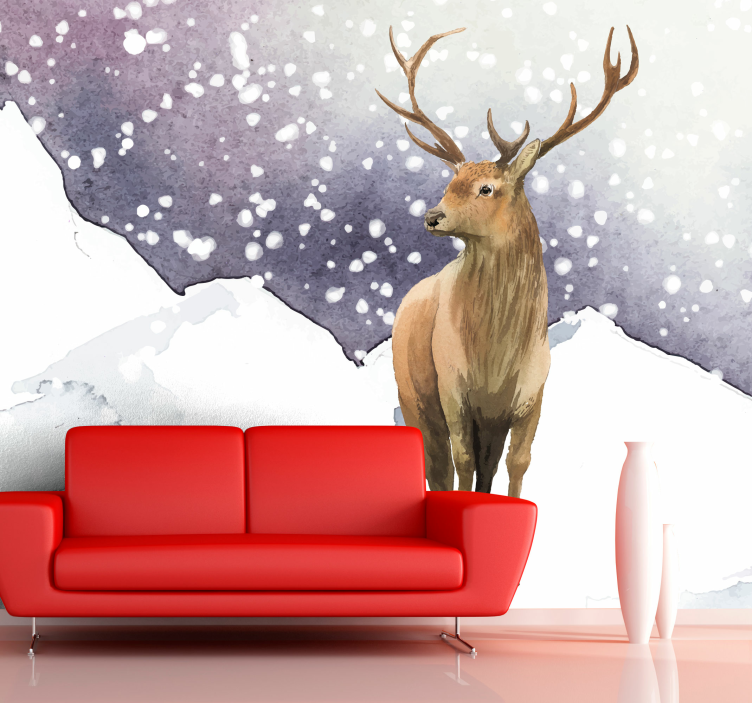 Transform your living space with our stunning Animal wall mural majestic deer scene. This captivating design features a regal stag amidst a serene winter landscape adorned with soft snowflakes. The exquisite watercolour painting brings to life the majestic deer as it roams through the mountains, encapsulating the beauty of wildlife in a tranquil setting. Let this mural bring warmth and elegance into your home!