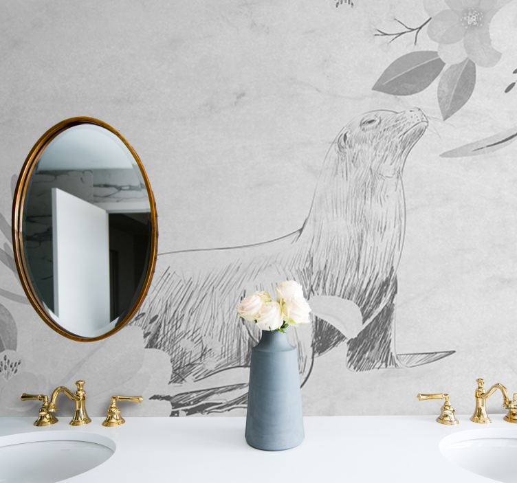 Transform your space with our stunning Bathroom wall mural seal surrounded by flowers. This exquisite design features a beautifully illustrated seal, surrounded by delicate flowers, brought to life in a captivating grayscale sketch. The artistic representation of this animal amidst nature adds a touch of serenity and elegance to any bathroom, making it a perfect choice for those who appreciate fine art and natural beauty.
