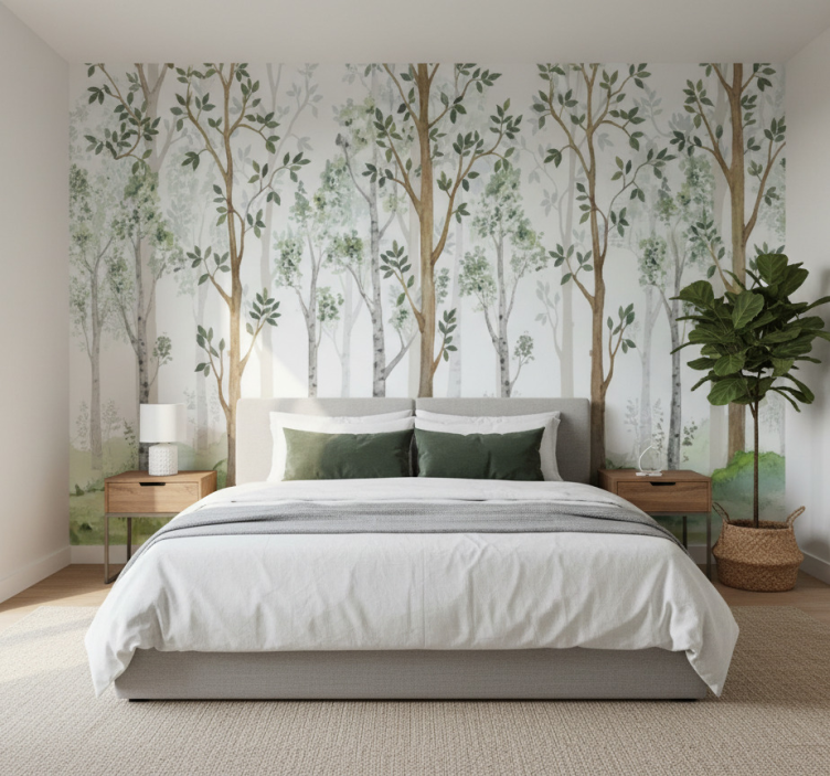 Forest wall mural with minimalist botanical design