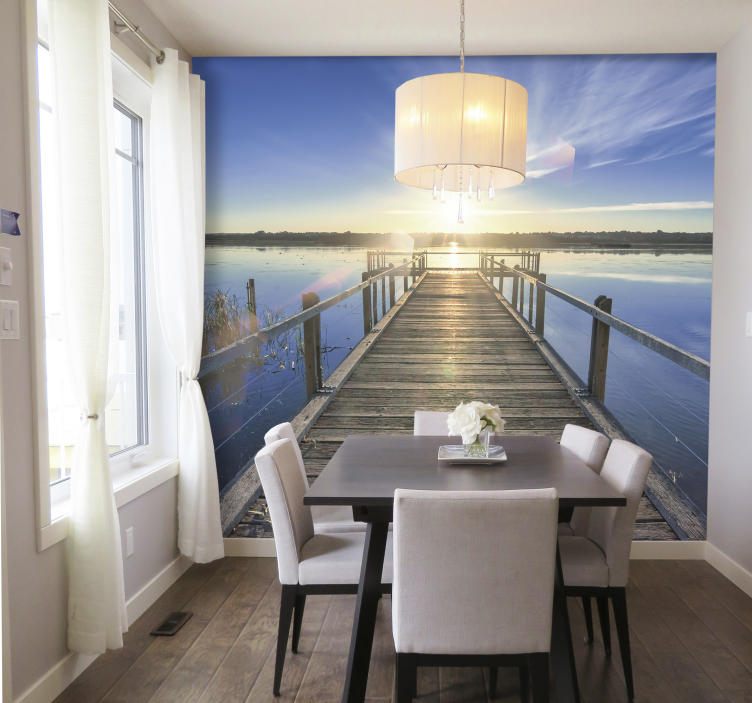 Transform your space with our stunning Landscape wall mural pier sunset view, featuring a breathtaking 3D effect that captures a serene sunset over tranquil waters. The design showcases a beautiful blue sky, a charming wooden dock, and a picturesque walkway leading to the pier, creating an inviting atmosphere that brings nature indoors.