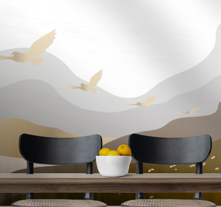 Transform your space with our stunning Nature wall mural flying birds silhouettes, a breathtaking design that encapsulates the essence of nature. This artistic illustration features graceful birds soaring amidst majestic mountains, captured in striking silhouettes against a golden backdrop. The harmonious blend of nature and artistry invites a sense of tranquility, making it a perfect addition to any room!