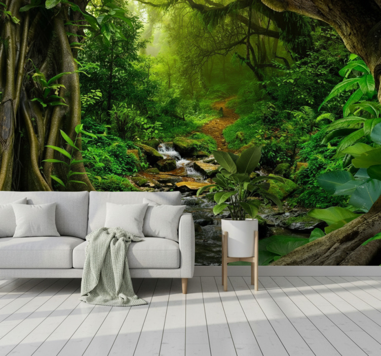 Reference: F11910Transform your space into a serene getaway with our Tropical forest oasis forest wall mural. This stunning design features vibrant greenery, exotic flora, and a lush ambiance that invites the tranquility of nature into your home. The mural is crafted with matt colours that enhance its visual appeal, while the non-woven wallpaper material ensures durability and ease of application.